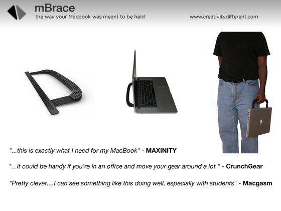 「Kickstarter」でまたもやおもしろそうなプロジェクトを発見。今度はMacBookのヒンジ部分に挟みこんで使う持ち運び用のハンドルです。折りたためばそのままスタンドにもなっちゃいます。これはなかなか便利そう。